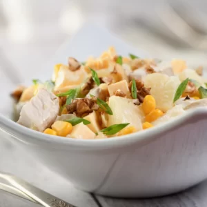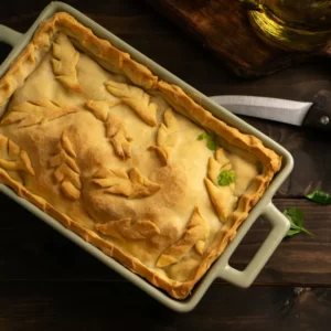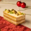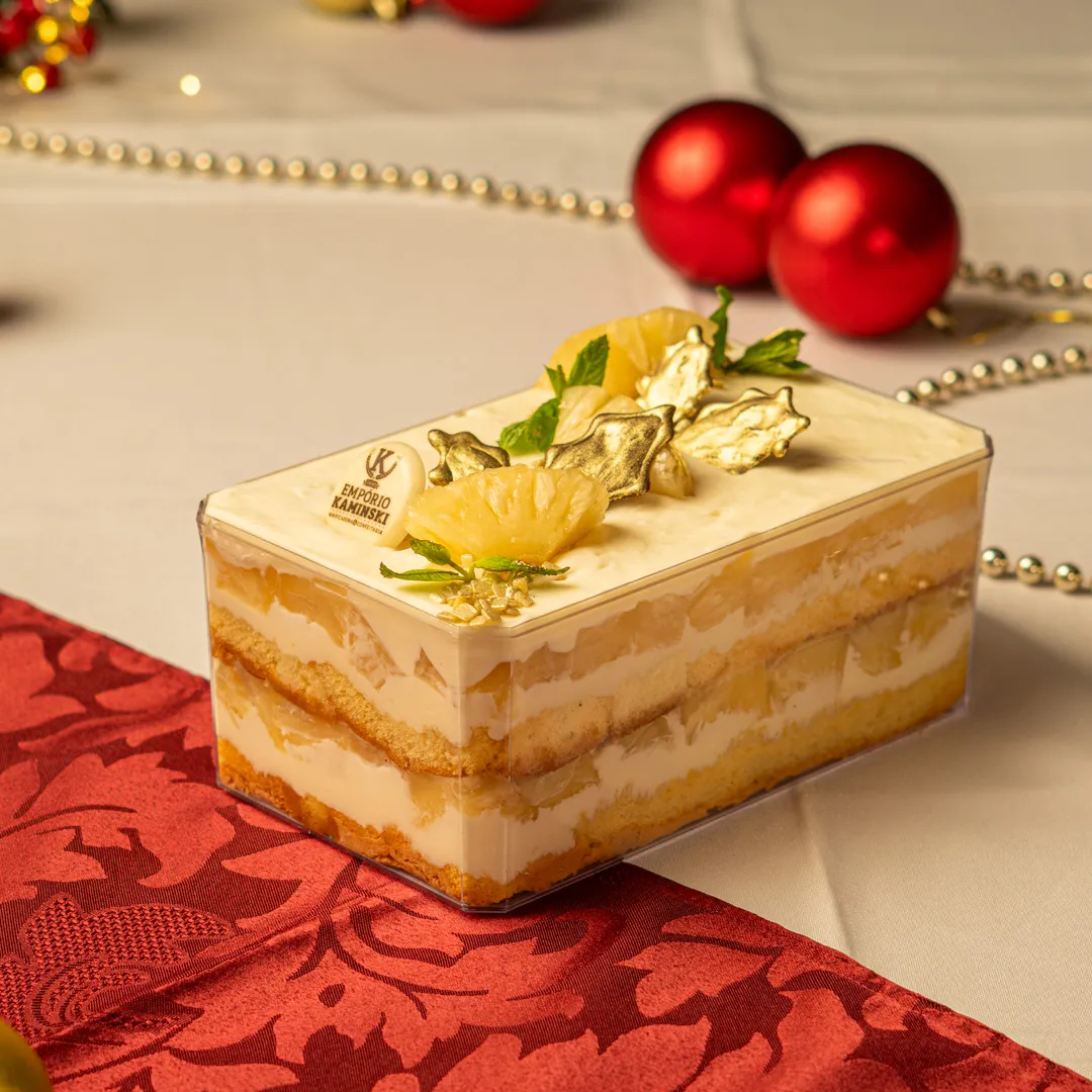 Camadas de mousse leve de chocolate branco intercaladas com geléia kseira de abacaxi e pão de ló molhadinho. Finalizado com nata batida adocicada, folhinhas de hortelã e arabescos de chocolate.