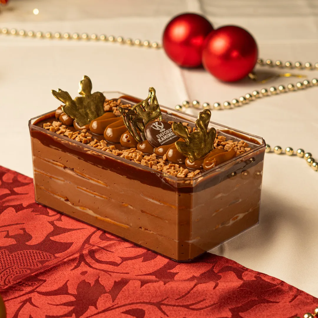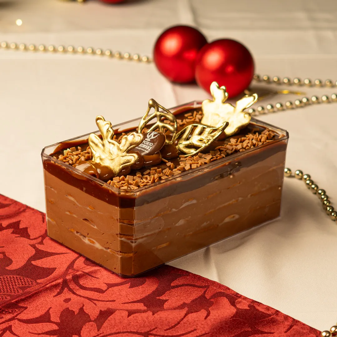 Camadas de creme de chocolate com doce de leite intercaladas com biscoitos banhados no leite. Finalizado com ganache de chocolate e arabescos de chocolate.
