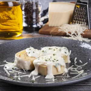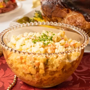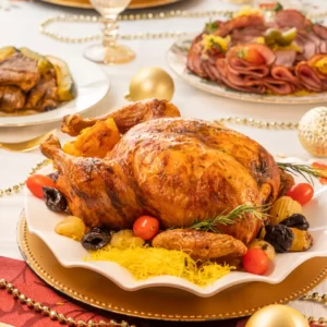 Pernil de porco assado em marinada de vinho tinto, shoyu, louro, suco de limão, azeite, cebola, alho e tomilho. Perfurado com dentes de alho e pedaços de bacon assados dentro da carne. Servido fatiado regado ao próprio molho. NÃO INCLUI DECORAÇÃO.