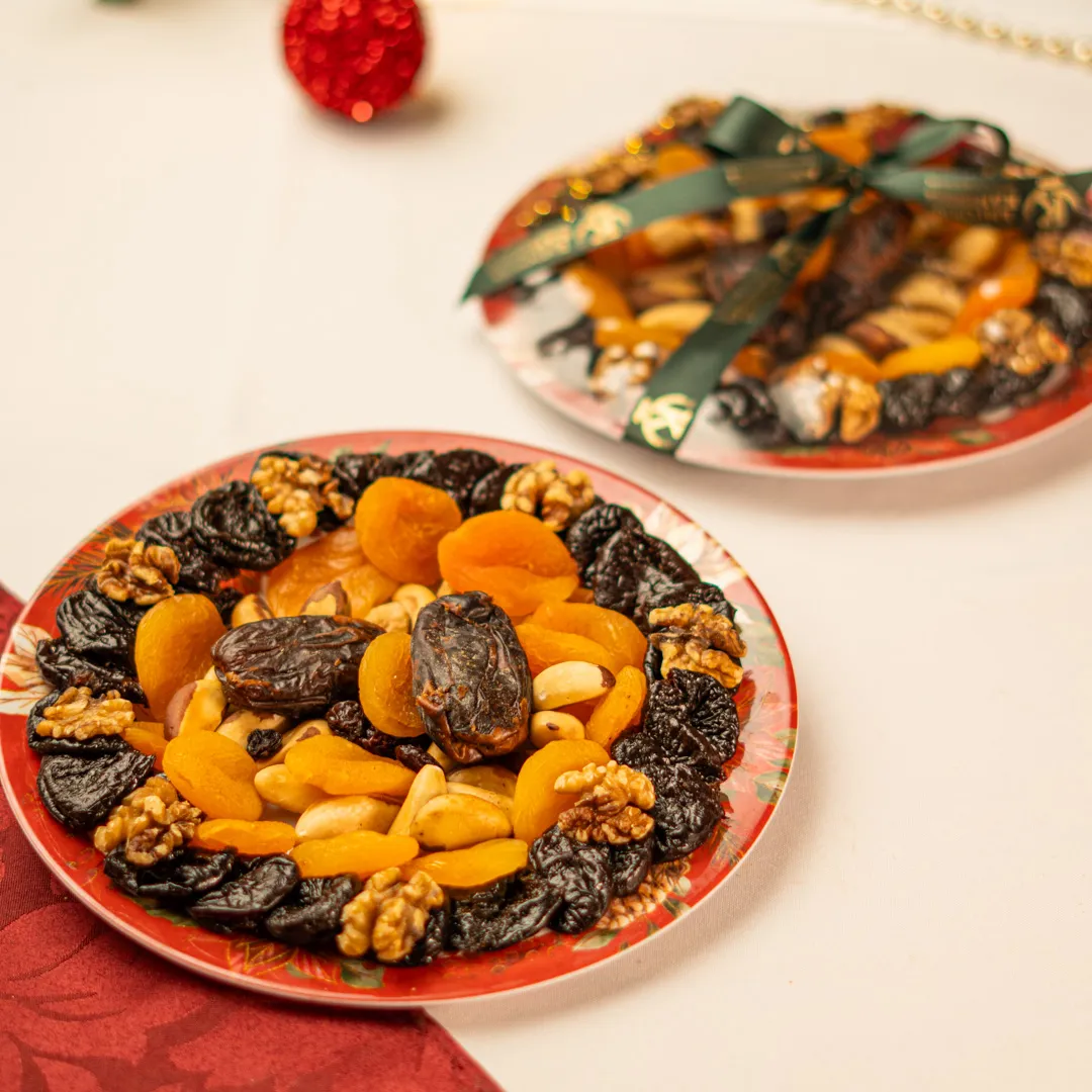 Prato especial montado com ameixa, damasco, tâmara, castanha do Brasil, figo, nozes mariposa e cereja glaceada.