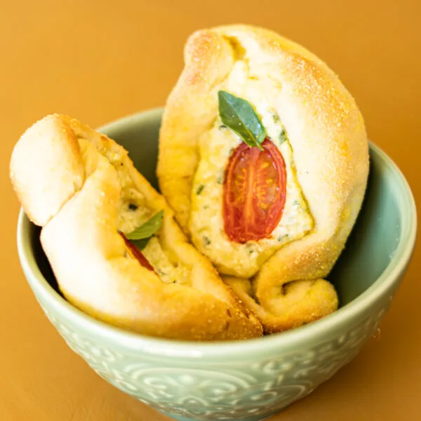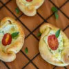 Massinha leve saborizada com azeite com recheio de mix de queijos temperado, tomatinho cereja e manjericão.