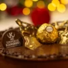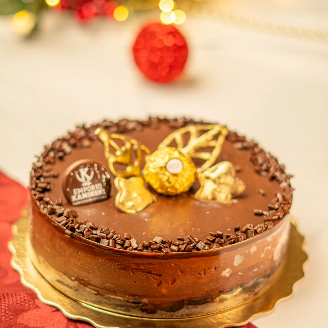 Massa de biscoito Oreo amanteigado com creme suave de Ferrero Rocher e crocante de avelãs. Cobertura de ganache de chocolate, crocante de avelãs, bombom Ferrero Rocher e arabescos de chocolate.